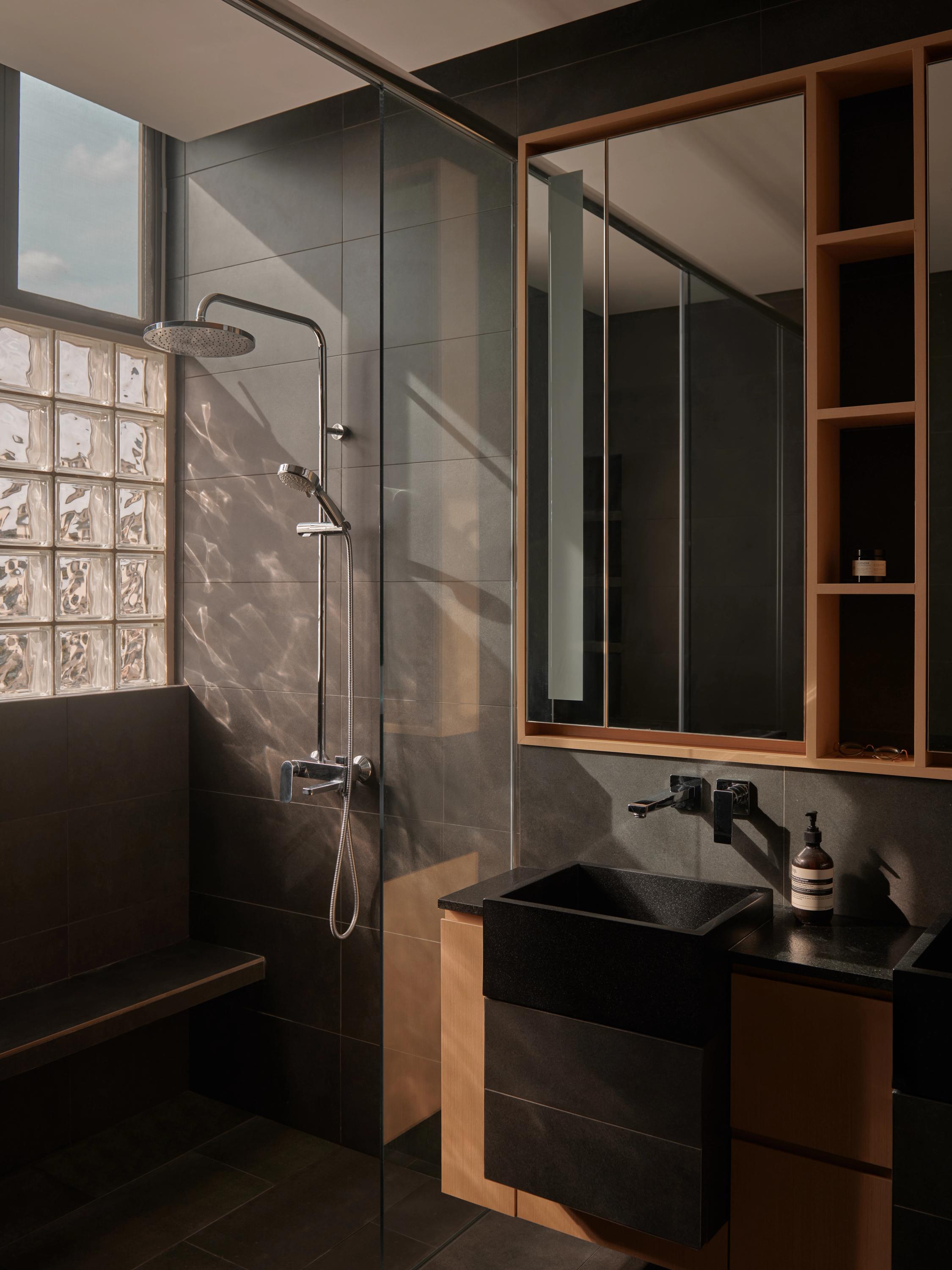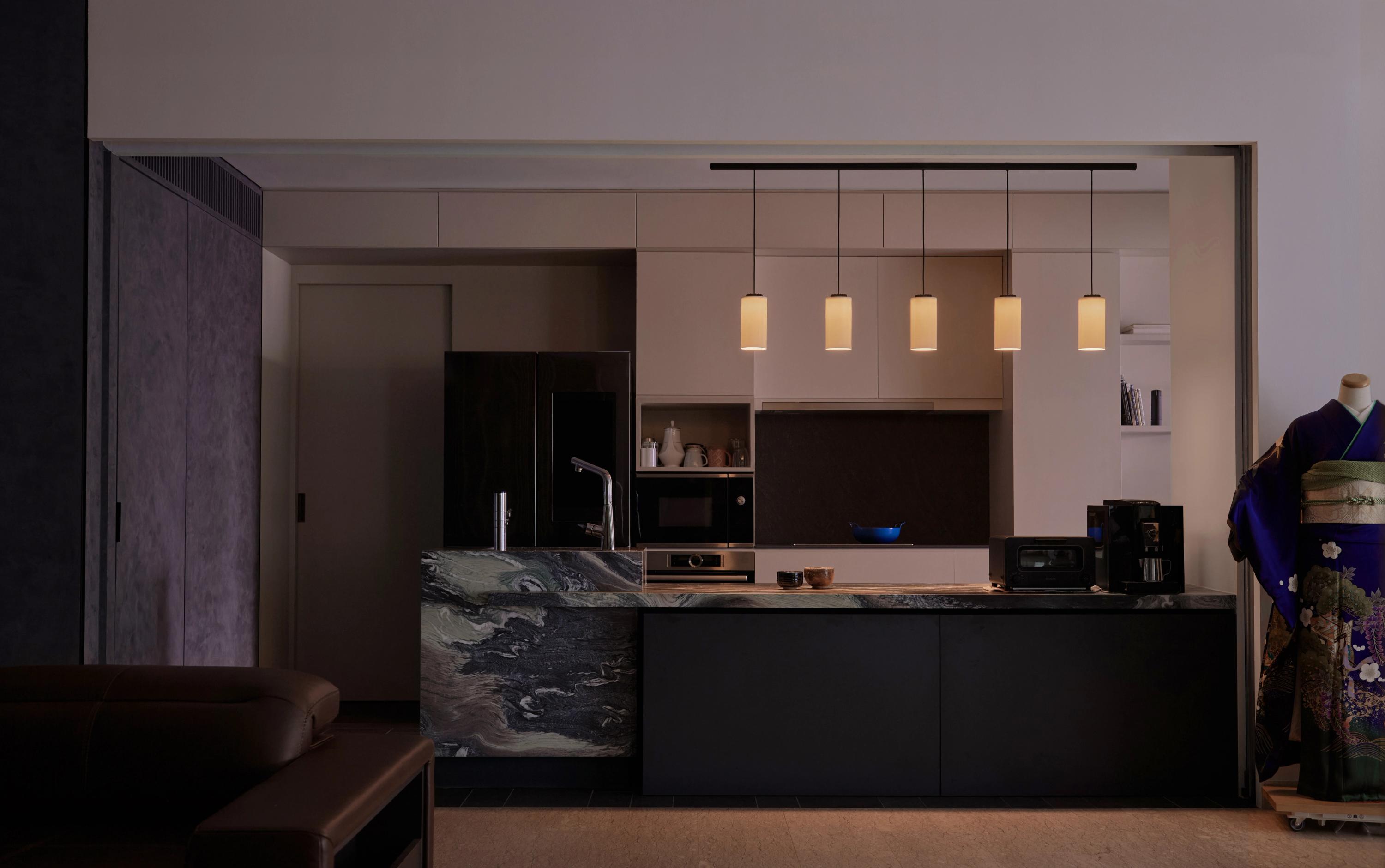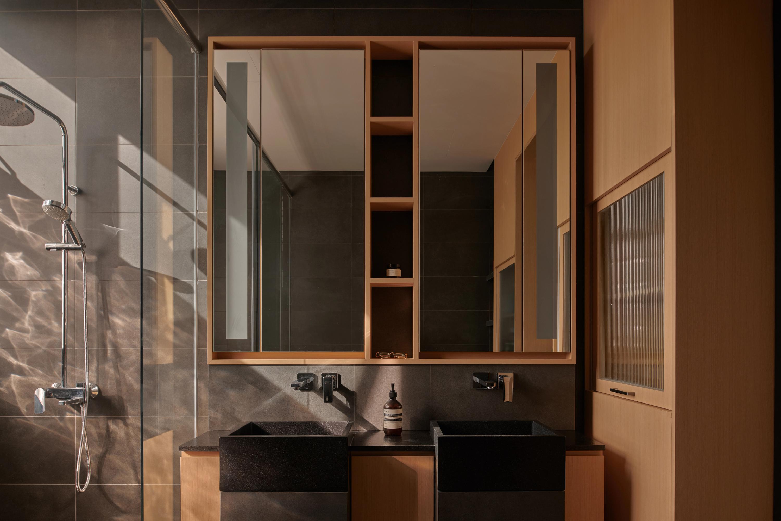 Existing light pink marble floors are paired with white oak joinery in the private domains to create a harmonious environment for the family, while a dramatic Rossa Luna marble kitchen island introduces a touch of artistic flair. The master suite incorporates a walk-in wardrobe and study corner, and the bathroom references a contemporary onsen through darker stone and timber finishes, enhancing comfort and adaptability.
