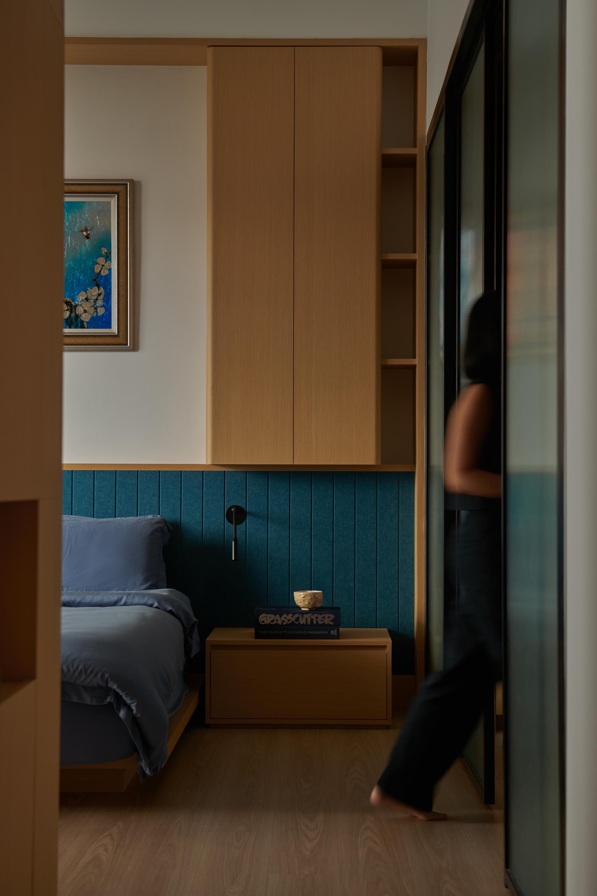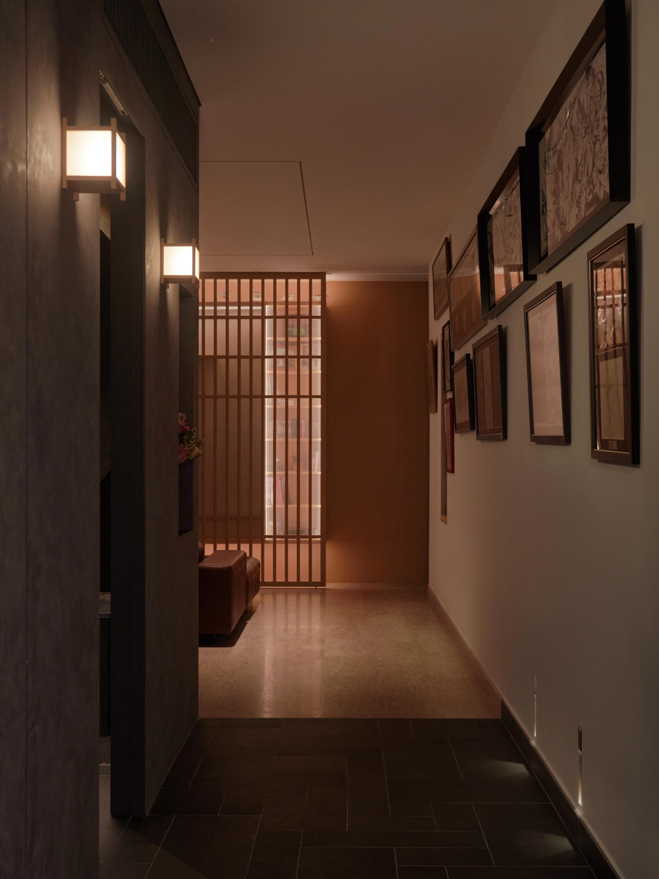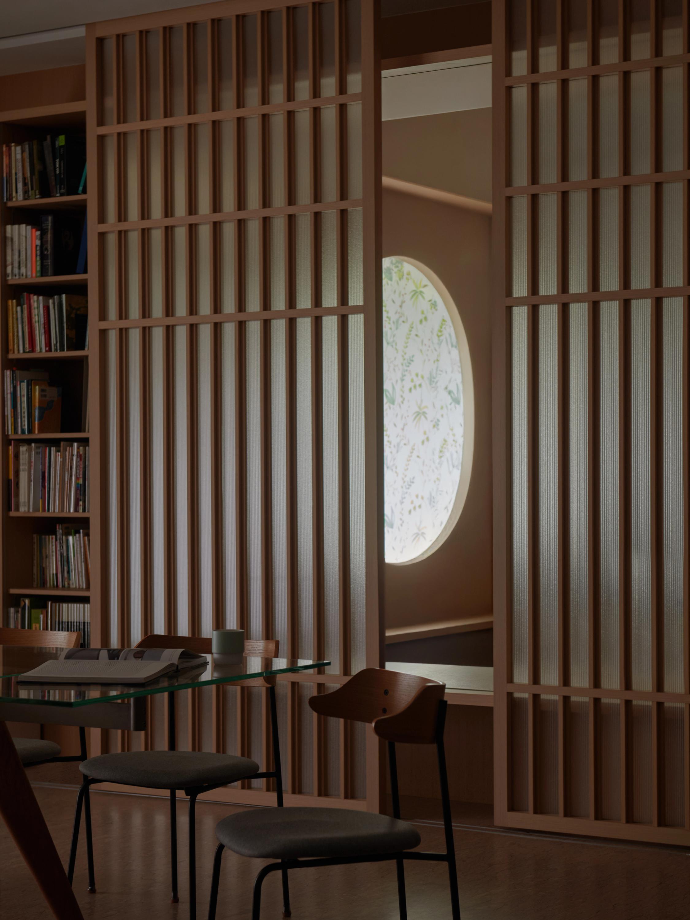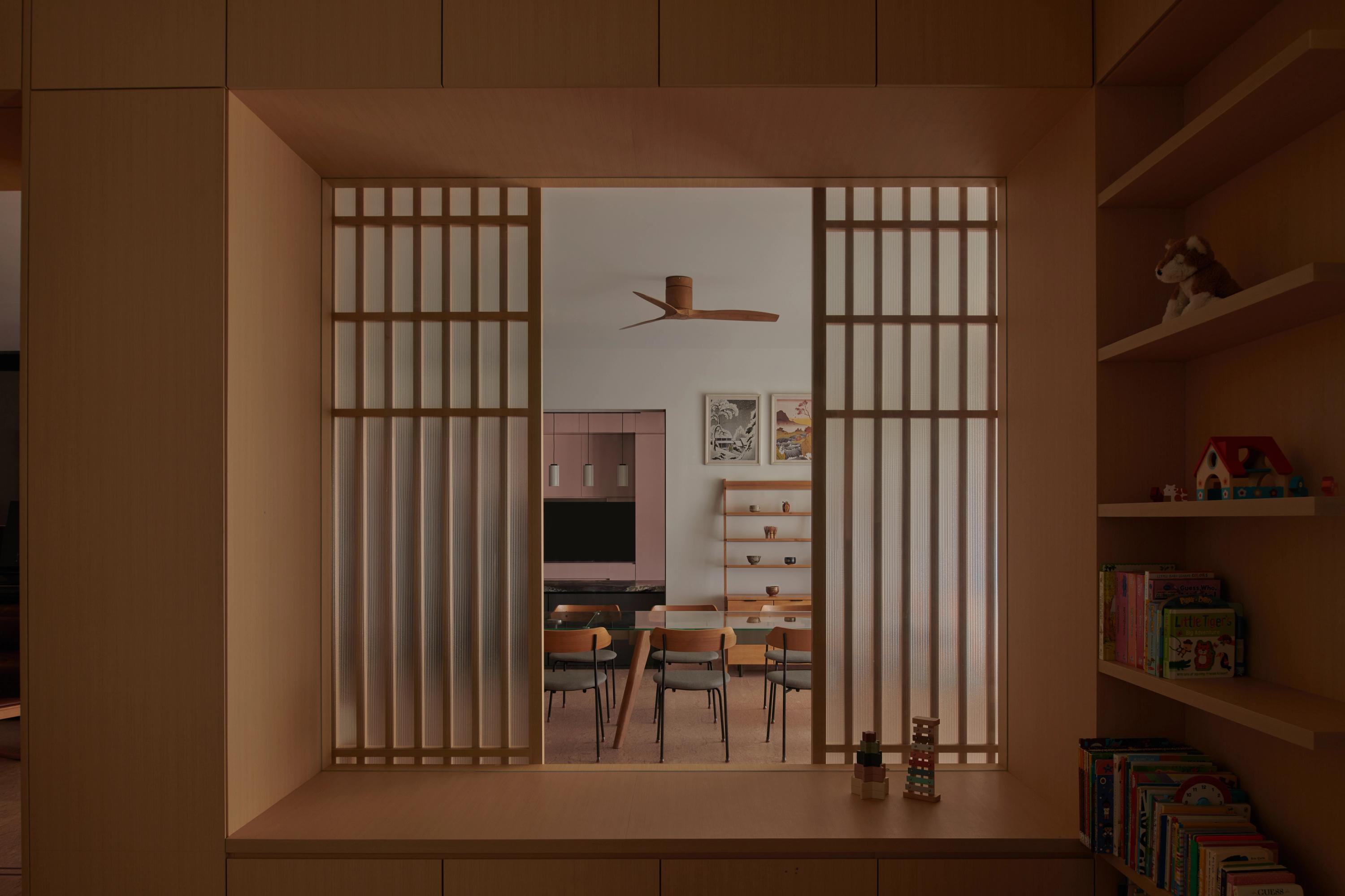 The project begins with a rethinking of spatial flow and visual connection within the home. Instead of relying on enclosed rooms, the design introduces carefully placed openings and framed thresholds to preserve openness while allowing moments of privacy. At the centre of the layout is a custom-built carpentry feature that integrates storage, concealed media, and a framed view into the children’s play area, encouraging interaction while maintaining visual calm. Shoji-inspired timber screens provide flexible layers between the playroom, dining area, and study nook.